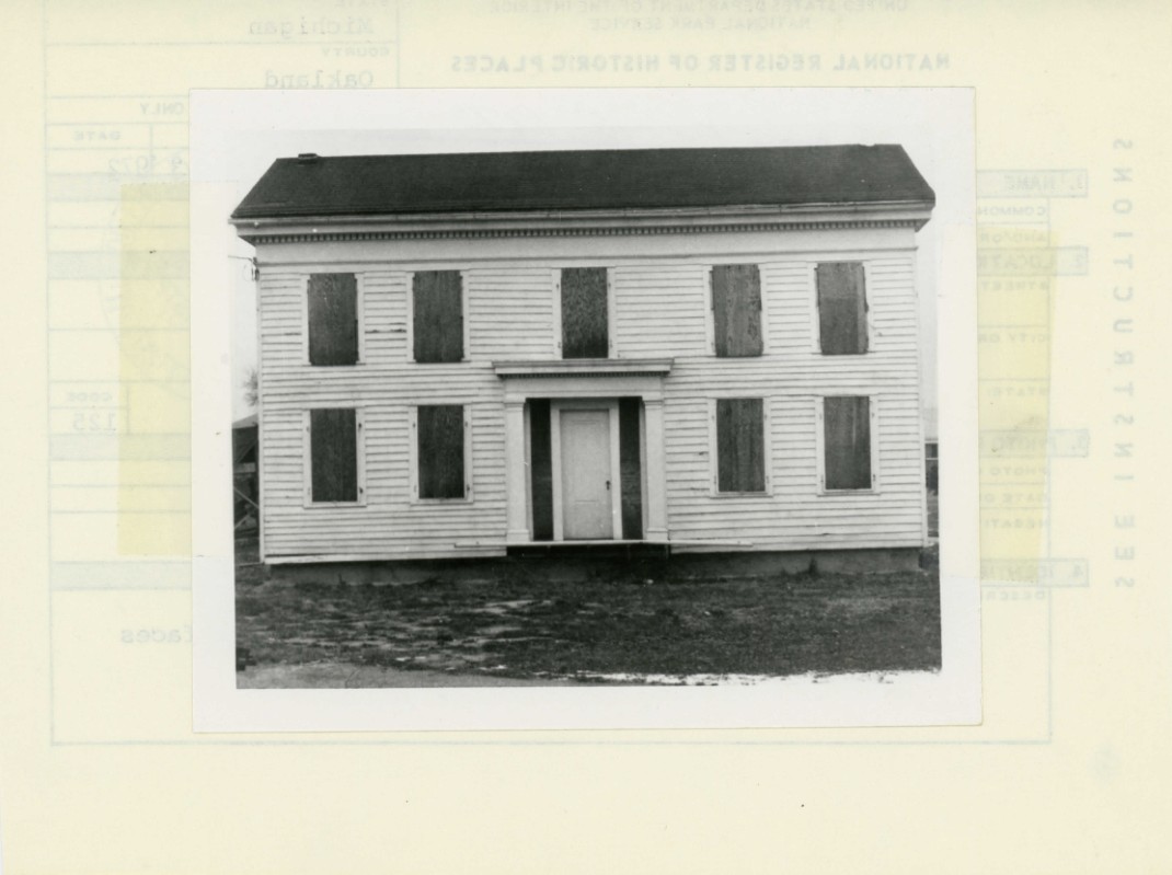 In 1823 young Solomon Caswell and his wife, Hulda, settled in Troy Township, Oakland County. The following May they purchased forty acres from John Valentine, Hulda's brother, and built a log house. Eventually Caswell had a sizeable farm, but he regularly supplemented his income working as a shoemaker. In the winters he commuted to Detroit, then nearby Bloomfield Center, and finally built a shop on his farm. Caswell probably built his fine two-story house in 1832. He made a one-and-a-half-story addition about 1850, and his heirs added a flat roof porch about 1920. Solomon died in 1880. Ownership of the house passed first to his son, then to his grandchildren. When the last Caswell died in the mid-1960s, the property was left to a friend who sold it to a local church as a site for a new church. At first it was assumed that the house would be torn down to make way for the church. But the furor created by the proposed demolition of the 'oldest house in Troy' resulted in the house's removal to a safe location behind the old city hall in 1968. Restoration is planned by the city historical commission. In its hundred and forty year history the Caswell House has been the home of just three generations of a pioneer family in Oakland County. It is the focal point of local enthusiasm for history and features a handsome front door and dentated cornice.