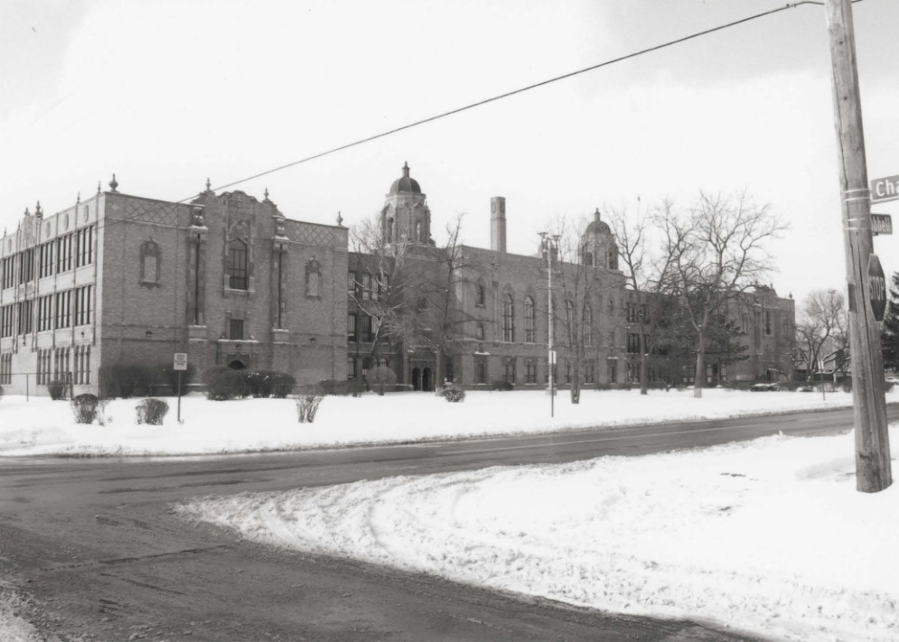 Thomas M. Cooley High School faces east onto Hubbell Avenue, off of Fenkell Avenue on the northwest side of Detroit. Its site occupies most of a large city block, with the exception of a row of commercial buildings along the north end of the block along Fenkell Avenue. The school building, opened in 1928, occupies the eastern third of the site, while the western two-thirds are devoted to athletic fields and a parking lot. This large, three-story, flat-roofed building is similar in floor plan to other Detroit high schools, such as Denby and Pershing, but differs from these examples in its elaborate Spanish Baroque inspired architecture. A modern two-story addition dating from 1971 extends this building to the north. This addition extends around a freestanding boiler house (contributing), enclosing it in a courtyard.