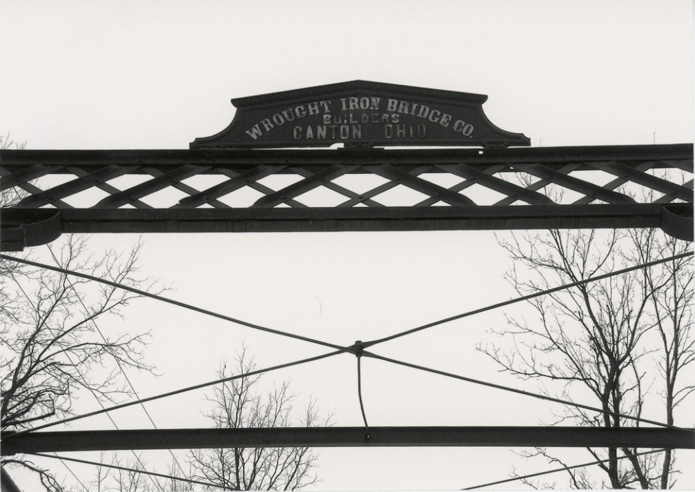 No documentation for the bridge's date of construction has been found, but the plaque on the portal of the bridge clearly identifies the manufacturer as the Wrought Iron Bridge Company of Canton, Ohio, which dates the bridge before 1899 since the company ceased to exist after this date. Based on records for construction of bridges in the surrounding area, if the current bridge is the original iron truss bridge at this location, the Delhi Bridge was likely built between 1888 and 1890. Dates of construction for the nearby Tubbs Road and Zeeb Road bridges were 1888 and 1890, respectively. Moreover, an eight panel iron truss bridge appears in photographs from the early 1890s. However, if the current bridge replaced the original iron truss bridge after the 1917 tornado, it is only possible to conclude the bridge was built prior to 1899, when the manufacturer ceased to exist. The main members of the Delhi Bridge bear the stampings of the Trenton Iron Company. It was founded by Peter Cooper in 1847 and was absorbed into the American Steel and Wire Company, a subsidiary of U.S. Steel, in 1912. According to the book, Remembering Delhi Mills, by Nicholas Marsh, an iron truss bridge replaced the original 1851 wooden bridge. This wooden bridge appears in an 1874 Atlas of Washtenaw County.