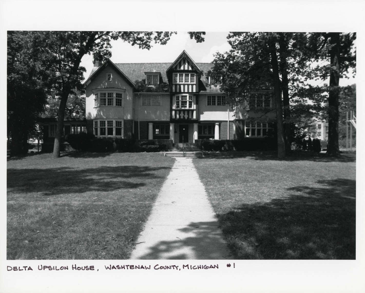 The Delta Upsilon Fraternity House is a two-and-one-half-story, basically rectangular, side-gable, Arts-and-Crafts-influenced, Tudor Revival building clad in brick in the first story and stucco in the second, with half-timbered and shingled accents. The balanced, south-facing front has a shallow E-shaped plan, with a slightly projecting, front-gable wing at each end of the facade and a narrow, three-story, front-gable projection marking the center of the facade. The center of the facade between the wings displays a recessed portico supported by four round columns. The central front-gable section has casement windows at the attic story, vergeboards with applique detailing, and half-timbering in the upper stories. The facade features casement and double-hung windows grouped in units of two, three, and four. Shed dormers containing paired casement windows pierce the slate-clad roof. The house's first story contains a large entrance hall occupying the central third of the building. This is flanked on the east by a dining hall with kitchen behind and west by a living room with attached sun room. A double-run staircase in the hall with its lower landing facing the central front entrance provides access to the second and third (attic) stories, which contain living quarters off a central corridor in each story. The first story -- especially the hall, with its beamed ceiling, panelled walls, and knee-braced posts flanking the staircase -- displays a decorative scheme inspired by English late Medieval domestic interiors, but has an overall Arts-and-Crafts feeling. One of the principal interior decorative features is a panelled recess in the center of the living room's west wall on axis with the hall that, framed by Tuscan columns and entablature, contains built-in seats flanking a Pewabic-tile-decorated fireplace with an elaborately carved mantel and overmantel depicting the fraternity logo. A proposed renovation will upgrade the building without altering its historic character. The renovation will include the addition of a small wing in matching style to the back of the building's east end to provide a larger kitchen, second stairway, and handicapper-accessible ramp and restrooms. Delta Upsilon stands in a late nineteenth- and early twentieth-century neighborhood located a short distance southeast of the University of Michigan's Central Campus. The house stands well back from Hill Street on a large, rectangular lot that contains a lawn with remnants of the wooded grove in which the house was built in front and a parking area in back. A drive along the east edge of the property provides access.