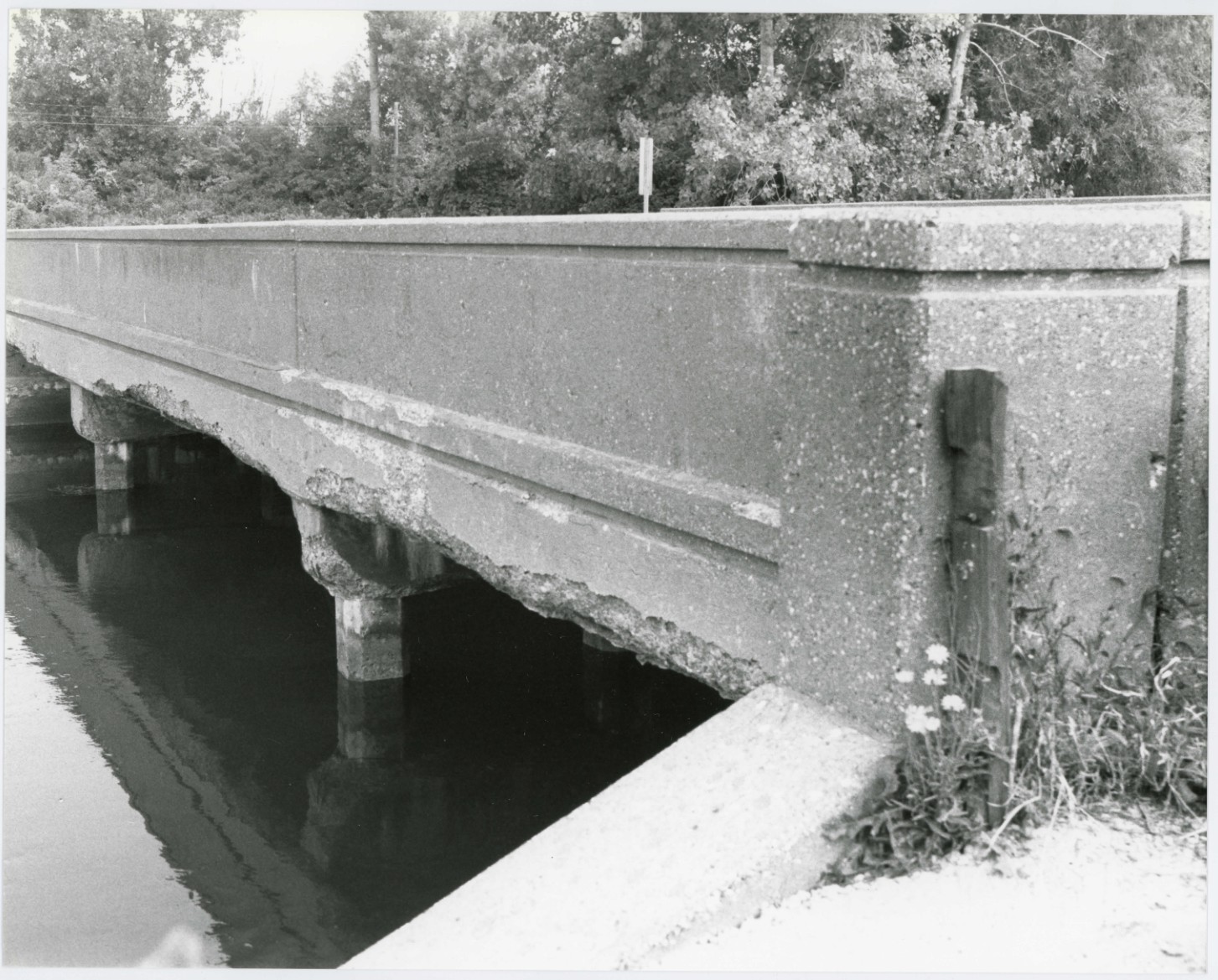 The East River Road Bridge is eligible for the National Register under Criterion C as a representative example of a continuous concrete-slab bridge. It is also eligible under Criterion A as an example of the evolution of the road commission's bridge design. The Ferry Street Bridge over the Thorofare Canal, also on Grosse Ile, is eligible under the National Register under the same criteria. The East River Road Bridge was built as part of a project to straighten and widen a section of the south end of East River Road. The road, which had run along the bank of the Detroit River, was moved to the west, and the existing timber bridge was removed. Plans for the new bridge were approved by chief designer Julian C. Mead in February 1944. The bridge was apparently not completed until the following year. The Wayne County Road Commission used the continuous concrete slab as a standard bridge plan in the years during and after World War II, presumably in part to minimize the use of steel, which was expensive and difficult to obtain during this period. The commission experimented with different forms for the precast concrete bent piles. On East River Road, the piles are octagonal in section.
