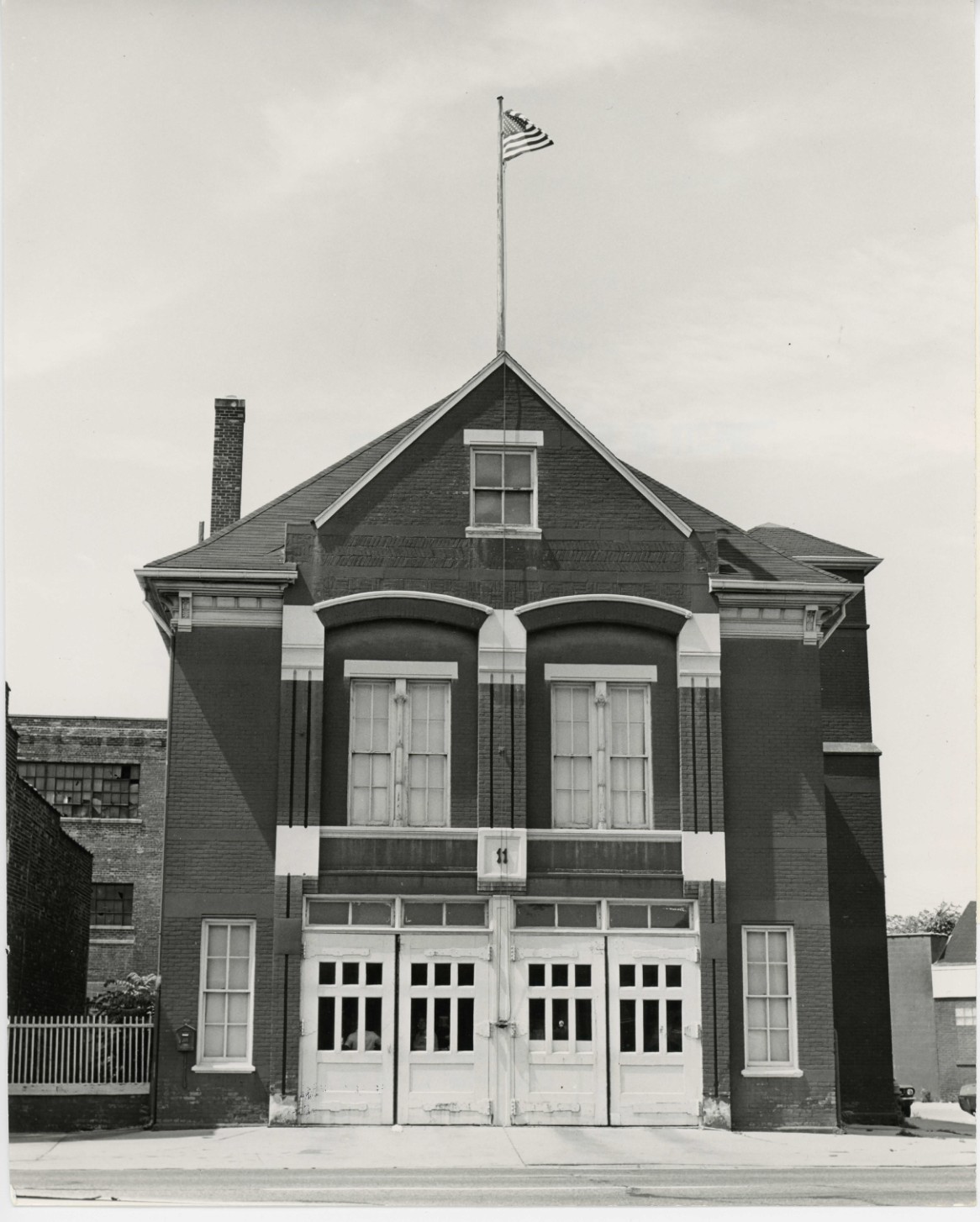 Engine House No. 11 is a two and one-half story brick structure with a hipped roof. The main elevation consists of a center section delineated by ornamental brick pilasters flanked by two small bays. The ground level of the center section contains four large doors. The second floor has two large windows glazed four over four. The brickwork of the center section rises through the roofline to form a dormer for the attic story. A flagpole is affixed to the peak of the dormer roof. The hose-drying tower is centered on the east facade. Fenestration on this facade is irregular. The hose-drying tower was reduced in height during World War II when an air raid siren was installed. Some window openings on the rear (north-west) facade have been bricked up. The first floor interior walls are wainscoted and plastered. The ceilings are plastered with exposed wood beams. The apparatus room, kitchen, dining area and lounge are on the first floor. On the second floor are the sleeping quarters, showers and locker room. Two private sleeping rooms were provided for the Captain and the Lieutenant. To the rear of the dormitory, on a slightly lower level, is a recreation room that was originally the hay loft. The third floor is the attic floor.