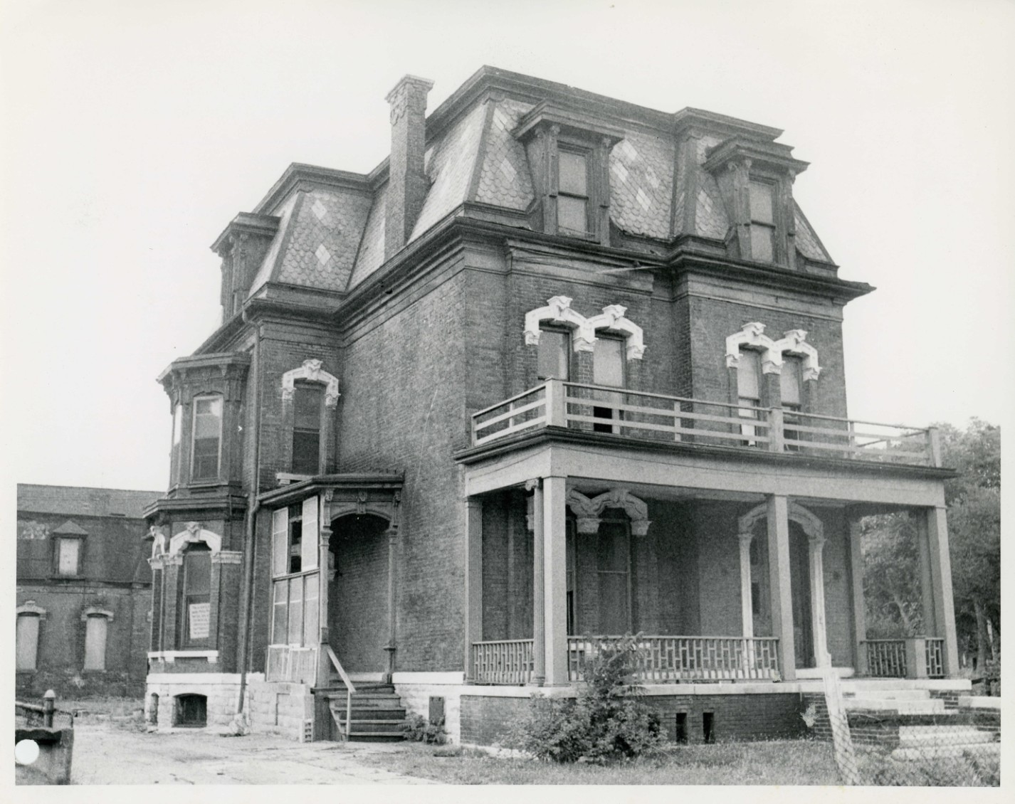 The Hudson/Evans house stands on lots nineteen and twenty of the Edmund A. Brush subdivision in Detroit. In 1871, a warranty deed for the property was issued to William H. Craig, a wealthy land speculator, who had been residing in a home on the west half of lot twenty since 1868. The next year, 1872, Craig sold lot nineteen and the east half of lot twenty to Fannie E. Wright, wife of Philo Wright a local shipowner. The Wrights are first listed in the city directory as occupying the site in 1874. This puts the construction of the house at some point between 1872 and 1874. The Wrights lived in the house until 1881 when it was sold to David Whitney Jr. The house was a wedding gift to his daughter Grace who in 1882 married John E. Evans of the firm of Evans and Walker Wholesale Grocers. The couple lived in the house until Evans died in 1892. Mrs. Evans continued to occupy the house until 1893. In the years following the death of her first husband, Grace Whitney Evans became deeply involved in charitable activities. She was the first president of the Detroit Y.W.C.A., and a short time later, she built a home for working girls. Even following her marriage to John J. Hoff in 1900, and her subsequent move to France, where she lived for the rest of her life, she remained interested in the Detroit Y.W.C.A. She gave the organization $35,000 in 1904 to enable it to open its new home on Washington Boulevard free of debt. In 1927, she gave $55,000 to the campaign which raised funds for four buildings, including the present Y.W.C.A. building. On her numerous trips to Detroit, she remained actively interested in the Grace Whitney Hoff Federation of Industrial Girls Clubs which she had founded within the Y.W.C.A. Yet her charitable activities were by no means confined to Detroit. While living in Europe she became deeply involved in the establishment of a British-American Y.W.C.A. in Paris, did all she could to help American and French troops during World War I, and personally paid for an elaborate international student center in Paris in 1928. For these, as well as other activities, she received numerous awards which included: election to the Legion of Honor in 1925, the Order of Queen Elizabeth of Belgium, and an honorary Doctor of Law Degree from the University of Western Ontario in 1934. When Grace Whitney Evans left 79 Alfred in 1893, she rented the house to another famous Detroiter, Joseph Lowthian Hudson, who lived there from 1894 to 1904.