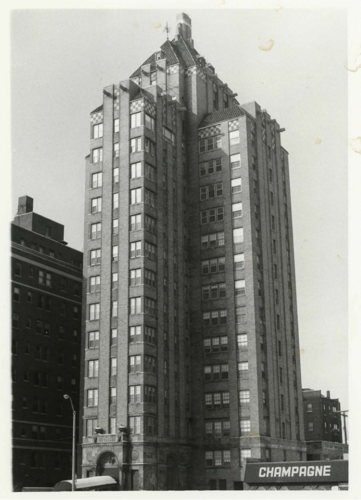 Description The Kean is a striking Art Deco apartment building containing some Romanesque elements. The building is sixteen stories high, containing four apartments per floor. The main structure is brick; the entrance is embellished with light orange terra cotta, inset medallions, and Corinthian columns. The vertical surfaces rise the full height of the building. The hipped roof is tiled, and edged with a red and white checkerboard pattern and projecting gargoyles.