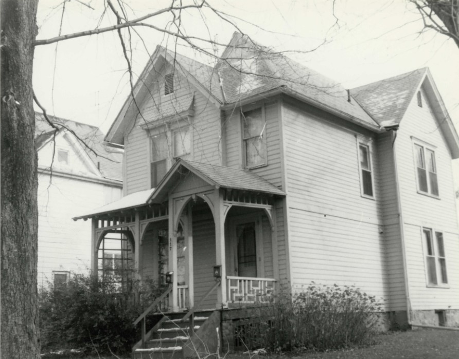 This modest residence is a nicely preserved example of Eastern Stick Style design in near original exterior condition with a well-articulated Eastlake porch. The lack of tax records and abstract make it impossible to date this building exactly or to determine its original owner. The building appears on the 1888 Sanborn map but not on the 1872 Bird's Eye View. Charles Miller and his wife, Anna, occupied the house c. 1889 after their marriage. Miller, son of Alfred Miller and grandson of pioneer Leonard Miller, operated a livery business with his father behind the Exchange Hotel, then located on Chicago Street on an adjoining lot. A subsequent owner was Fred Walker, who moved into town in the early 1900s after retiring from farming.