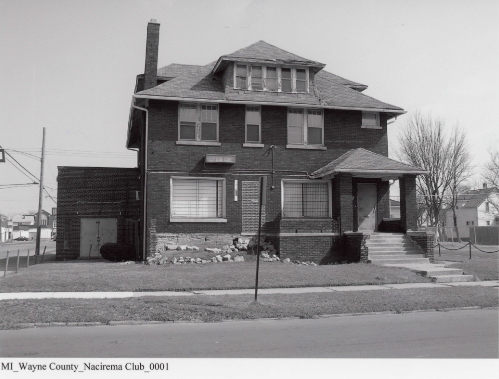 The Nacirema Club's clubhouse housed a leading social organization in Detroit's African American community. This men's social club was first established in 1922 and formally organized the following year. In 1925 the club occupied the present building, constructed as a house five years earlier. From its beginnings until the height of the Civil Rights Movement of the 1960s, the Nacirema Club was one of a limited number of Detroit social clubs open to African Americans (the others including the Urban League and the Association of Women's Clubs). The Nacirema Club was a key institution not only in the African American neighborhood on the city's West Side in which it stood that, bounded generally by West Grand Boulevard and Livernois between Tireman and Warren, housed many leading members of the city's African American community, but for African Americans in the city as a whole. The club was the place to go for wedding receptions, proms, anniversary parties, and all social events that made up African American life in the city. In its heyday it boasted a ballroom, dining room, roaring fireplace, well stocked bar, and spacious lobby furnished in leather sofas. Members and their guests met and mingled and enjoyed dinner and late night dancing. The highlight of the year was 'Nacirema Week.' During this special time the club hosted a Sunday church service, racetrack party, dinner dance, picnic, card party, and a moonlight boat ride. But the clubhouse also hosted a broad range of meetings and events that included not only church and block club events not directly related to the club but also such other events as speakers' forums and campaign stops for political candidates. As long time Detroit Urban League secretary John C. Dancy noted, the club 'had a resounding voice in the community' and 'lent its efforts and influence to worthwhile projects all over the city.' Although the wives of members supported the club by sponsoring card parties, fashion shows, and other fund raisers, women were not afforded membership until 1998. The Nacirema Club declined rapidly in membership in the last few decades as older members passed away and the old West Side African American neighborhood itself has disappeared building by building. Though not formally dissolved, the club no longer has meetings or makes use of the clubhouse. Despite this, the building retains much of the club furnishings and memorabilia.