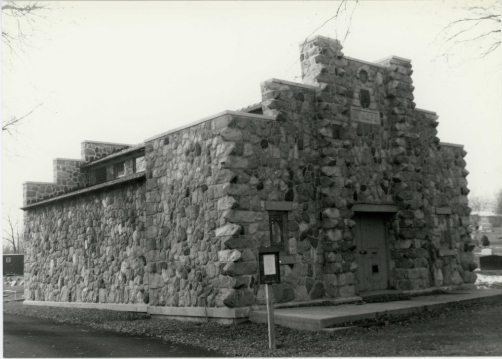 The Board of Cemetery Trustee's report to the Village Council in 1914 describes their intention to have built 'a sanitary and modern place of burial, for 80 to 100 people, a beautiful little chapel which can be used for funerals, not only for compartment owners in the Mausoleum, but also for other funerals in stormy or inclement weather'. The unusual fieldstone mausoleum was built 'by the O.J. McBride Company for the Washtenaw Mausoleum Company, under contract with the Village of Saline. The work of construction was under the superintendency of Dr. J.B. Wallace [superintendent of the Board of Cemetery Trustees], by appointment of the Village Council'. A Village Council minutes entry dated March 8, 1915, reports that the Mausoleum is almost completed. The building's dual use as a chapel and crypt accounts for its somewhat large size. The Oakwood Cemetery, in which the structure stands, includes land set aside for burial use by Orange Risdon during his original platting of Saline. Although Village records contain no further information on either the contractor (who was not local) or the Washtenaw Mausoleum Company, a phone interview with Larry Arnett--of the Arnett Cemetery Monuments Company of Ann Arbor, the oldest monument firm in the county--revealed that an identical mausoleum located in Ann Arbor's Bethlehem Cemetery was recently torn down. Arnett suggests that the Washtenaw Mausoleum Company was probably one of many franchises found across the nation during the 'Teens and Twenties. The City would donate the land, and the franchise would provide the plan and sell crypt rights to the City, or directly to subscribers. The Washtenaw Mausoleum Company never registered with the State, a fact which tends to corroborate the franchise hypothesis.
