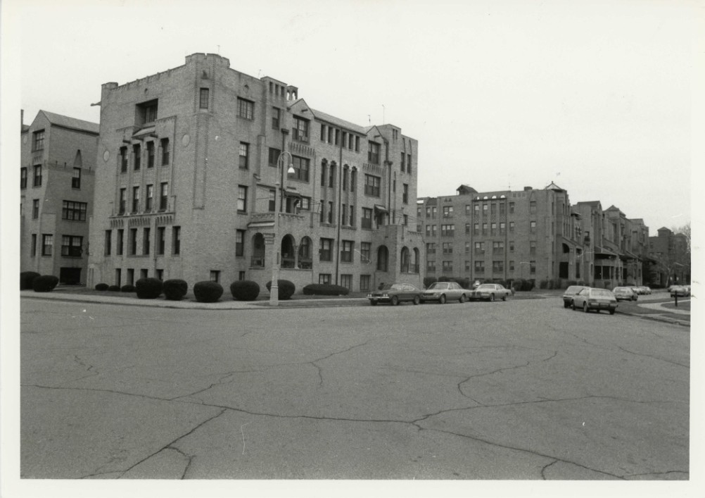The Palmer Park Apartment Buildings Historic District is located on the west side of Woodward Avenue about seven miles northwest of downtown Detroit. This part of Detroit was not settled until the 1920s and is primarily a middle class residential area of single family houses with strip commercial development along Woodward Avenue and the major neighborhood streets. Palmer Park is a community of 63 buildings. There are four religious institutions, 1 warehouse (originally a parking garage), 2 two-family flats, and 56 apartment buildings. The community is laid out on pleasantly curving streets bordering Palmer Park, a public park. Three wide plazas formed by the crossing of major streets provide focal points within the district at the intersections of Whitmore and Manderson, Whitmore and Alwyne, and Whitmore and Merton Road. Although little parking was originally provided for the buildings, today several surface lots and vacant lots form visual breaks in the streetscapes. To the south, the district is bordered by McNichols Road (also known as Six Mile Road), which is lined with generally undistinguished commercial strip development dating from the 1920s and later, including several bars, restaurants, gas stations, doctors' offices, and a church. Some of these buildings have flats above the stores. On the west, the district is bordered by large single family houses dating from the 1920s and after. These line both sides of Pontchartrain Boulevard and extend west to surround the Detroit Golf Club forming an exclusive upper-middle class residential area. On the north and east the district is bounded by Palmer Park a large, wooded, city park with recreation facilities. The buildings in the district are of brick with either terra cotta, cast concrete or stone trim. Although of mixed heights, they are mostly four stories tall, with some two-story and townhouse units. On the whole, the buildings are marked by fine craftsmanship and a high level of design. A large portion of the buildings date from the 1925 to 1929 period; another significant group from 1935 to 1940 and a third group dating from 1945 to 1955 with a sprinkling of structures from the early 1960s. Buildings of different periods and types are mixed throughout the area affording richly varied streetscapes of contrasting architectural styles. Generally the buildings are set back from the streets varying distances behind well landscaped lawns and planting beds of mature shrubbery. Stylistically, the buildings range from a variety of historical revival styles including Colonial Revival, Venetian, Spanish, Mediterranean, Tudor and Beaux Arts influenced classical, through most phases of the modern movement including the International Style, Art Deco, Art Moderne and the 1950s and 1960s modern styles. They also exhibit a full range of multi-family dwelling types and concepts ranging from townhouses to duplex flats, although the majority of the buildings contain typical, one-level, apartments ranging in size from studios to four bedrooms. The structures were intended for a variety of tenant types and income levels and range from large, luxury units with elaborate interior finishes, fireplaces and servants quarters to Spartan one-room efficiencies. For the most part, they are well maintained and unaltered.