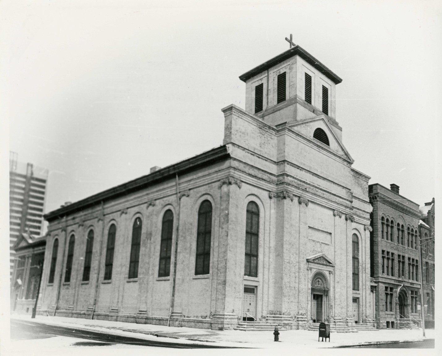 This Plain Roman style building is the oldest extant church in Detroit that is still being used as a church, having been used as a place of worship for 121 years. It had the distinction of being studied by the Historic American Buildings Survey team in 1934. The church was built during the tenure of Bishop Peter Paul Lefevre to serve as the Cathedral of the Detroit Diocese. Shortly after his consecration, Bishop Lefevre found himself in the embarrassing situation of trying to solve the financial difficulties his predecessor had incurred with the Corporation of St. Anne. He did so by rigid economy and subsidies from the German and French missionary societies. His experiences with the Corporation resulted in his determination not to be subject to lay control during his tenure as Bishop. Hence, he purchased a plot of ground on the northeast corner of Jefferson Avenue and St. Antoine Street and began the erection of a church and residence that would be completely free of lay control. The church was designed by Francis Letourneau and Peter Kindenkens. Letourneau, a 'boss builder' in Detroit in the 1830s, was a native of Mt. Clemens. He moved to Detroit in 1812 to learn the carpentry trade and to study architecture. He built the wooden dwelling of Thomas Palmer, which was at that time considered the best house in the city. He also built the Michigan Exchange Hotel, steamboats, several lighthouses, and the building of Ft. Wayne. Peter Kindenkens was a seminarian from the Diocese of Ghent, Belgium. Bishop Lefevre ordained him in September, 1842, and made him his vicar-general. Kindenkens also supervised the building of Saints Peter and Paul's. Construction was slow because the Bishop paid cash for each stage built. The building of SS. Peter and Paul's was a step toward the abolition of trusteeism in the Detroit Diocese. The church was consecrated on June 29, 1848. The Rev. John Farnam was the first priest. Bishop Lefevre used the church as his cathedral until his death in 1869.