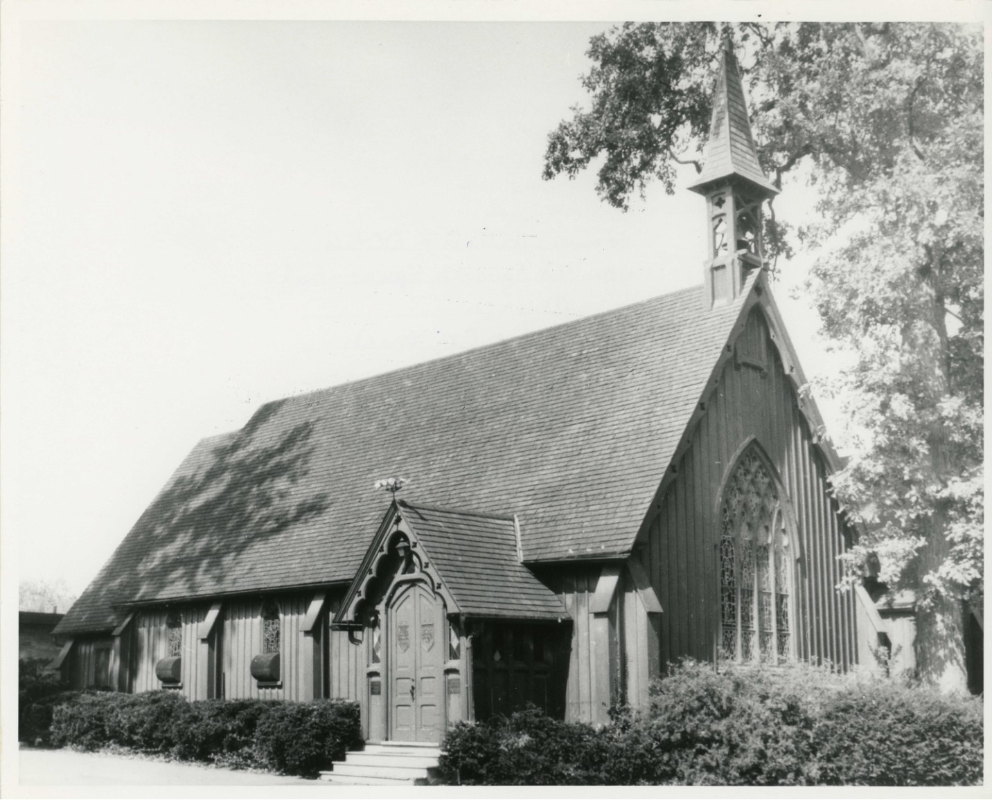 St. James Episcopal Chapel, built in 1867 and designed by Gordon W. Lloyd, is a Carpenters' Gothic edifice with vertical monochrome board and batten, gingerbread vergeboards, and steep pointed gables. Wooden buttresses support each of the side walls. There is a wooden bell cote above one end of the facade topped by a steeple and spire. The main entrance is in the gable facade of the one-story projection. It is a double-leaf, three-panel door with plain, recessed panels. The door and its structural opening have a center pointed arch. There are flush side panels on either side of the architrave with two stained glass windows in the top sections and two bronze memorial plaques in the lower sections. Three additions have been added to the original chapel, and it has undergone extensive repairs several times. The spire was snapped off the belfry by an airplane in 1945. During the 1940s the church was painted and redecorated, beams were replaced, and parts of the roof and belfry repaired. Three stained glass windows in the south wall and a large window in the east wall were presented in 1947. The Tiffany window 'Angel of Praise' was presented in 1898. A new pulpit was installed in 1949.