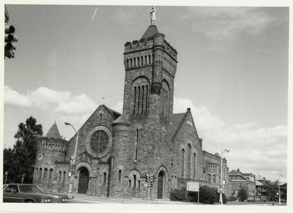 The complex is located on the northeast corner of Woodward Avenue and Medbury Street (now the Edsel Ford service drive). St. Joseph's Episcopal Church (now Holy Rosary Roman Catholic Church), built 1893-96, is a rambling, ground-hugging, rock-faced, cross-gable-roofed, sandstone, Romanesque Revival structure notable for its complex massing. The Woodward Avenue elevation is the entrance front. The gabled facade is flanked by a tall, square, pyramid-roofed tower at the corner of Medbury Street and by a lower, round, conical-roofed tower on the north. A one-story vestibule containing the arched entrance spans the facade between the towers. A huge round window fills the gable above the vestibule. The most notable feature of the facade is the soaring corner tower with its corbelled and battlemented parapet. The rectangular severity of the tower shaft is modulated by a two-story, semi-circular stair turret on the Woodward Avenue side and a round turret that projects from its outside corner at the upper levels. The oversized, gilded statue of the Blessed Virgin Mary crowning the tower's hip-roof is a striking feature and an addition. The Medbury Street side is the only other architecturally articulated elevation of the building. It is dominated by the massive gable of the transept which is pierced by a large, tri-partite, arched window. Arched double doors in the base of the tower provide a secondary entrance to the church. Extending to the rear of the church is the flat-roofed wing containing the sacristy and service rooms. Terminating the building is the chapel, a gable-roof, stone, Richardsonian Romanesque structure with a square, pyramid-roof, corner tower. The chapel was built in 1883-84 and served as the original St. Joseph's. The interior of the church was extensively re-decorated in the early 1970s to reflect contemporary taste. It retains its basic Romanesque plan and decorative features but has been painted a light cream (except for the stone columns) and furnished in a modern manner with a new altar and modern chairs rather than pews.
