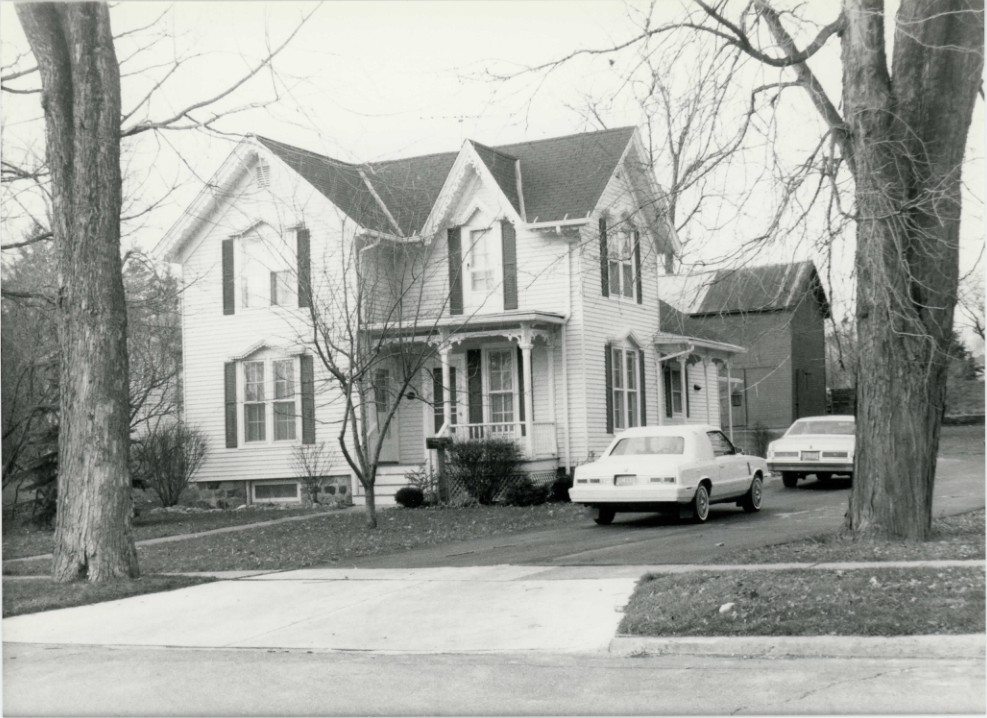 This elegantly-detailed residence sits on a lot landscaped with mature shrubbery and shade trees. Although covered with aluminum siding in the late 1960s, the two-story frame home retains its late Gothic Revival features in the peaked window trim, pointed-arch eaves line trim, and steeply pitched roof and dormer. The basically L-shaped plan contains a one-story rear garage addition and a front and side porch with brackets and trim at the eaves. A gabled-roof barn sits to the rear of the property.