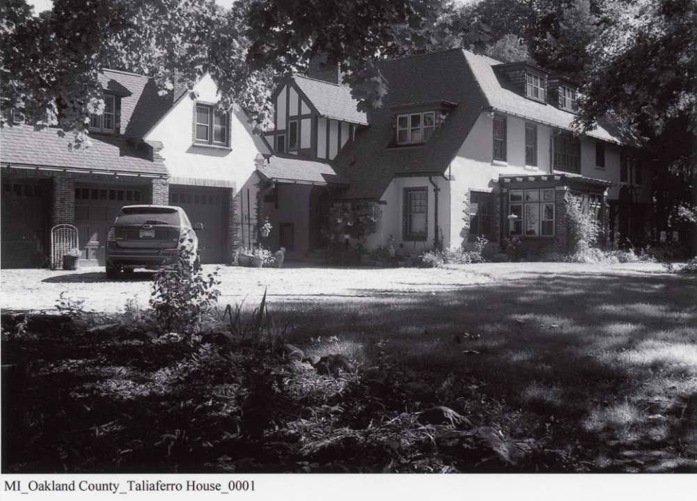 The Taliaferro House is a two and-a-half-story building of Tudor and Arts-and-Crafts design standing on a low, largely wooded hilltop site on a 3.7-acre lot in Trowbridge Farms, an early residential subdivision in Bloomfield Hills. The house has an asymmetrical, broadly T-shaped form, a combination of gable and hip roofs, and exterior walls clad in stucco with red brick and limestone trim and wood shingled dormers. A cross-gable-roof three-bay garage is aligned with the house's main axis and separated from the house by a gable-roof porte cochere.