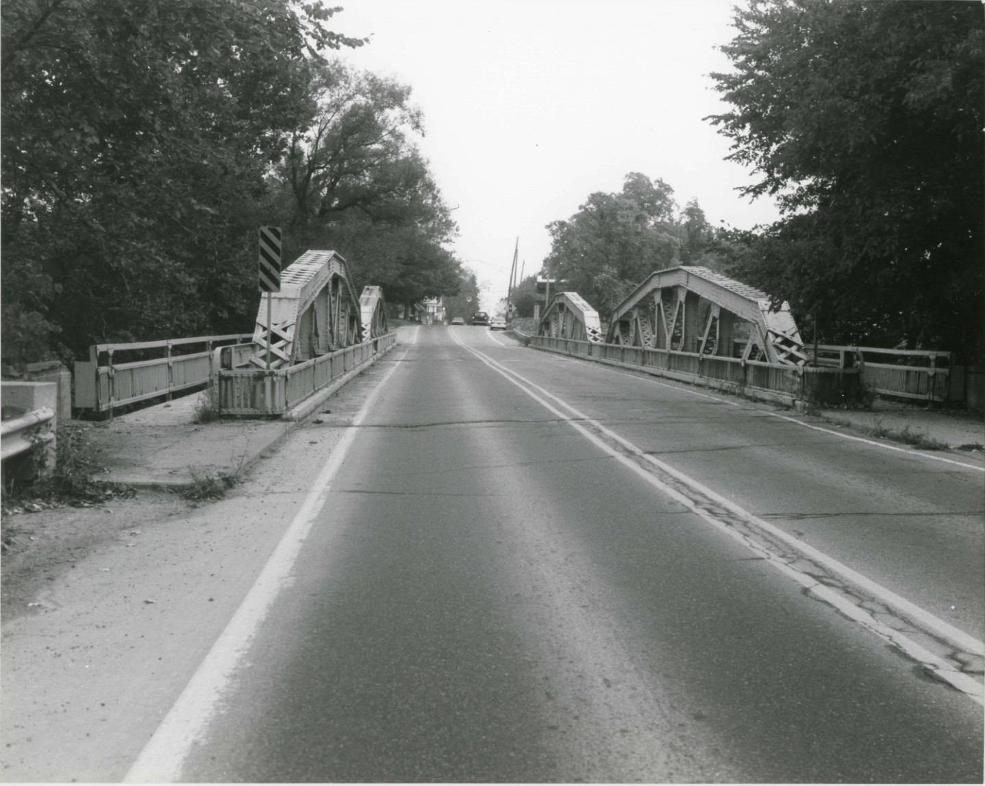 Waltz Road passes over the Huron River just south of the small community of New Boston, near the southwest corner of Wayne County. The Huron River is edged by woods. The land to the south is marshy. The Waltz Road Bridge is skewed, with the centerline oriented north-south. The bridge consists of two identical steel, 100-foot, 7-panel, camelback Pratt pony truss spans with a 27-foot roadway on a 29.7-foot-deck. The trusses are comprised of the following members: upper chord: built-up channel beam tied with X-lacing; lower chord: channel; verticals: built-up I-beam; diagonals: paired angles tied with V-lacing; floor beam: built-up I-beam; bottom lateral: paired angles. Sidewalks supported by metal brackets are attached outside of the truss on each side. Railings are angles with bar spindles; solid concrete parapets edge the approaches. The substructure features concrete abutments with U-shaped wing walls and solid concrete piers with rounded cutwaters.