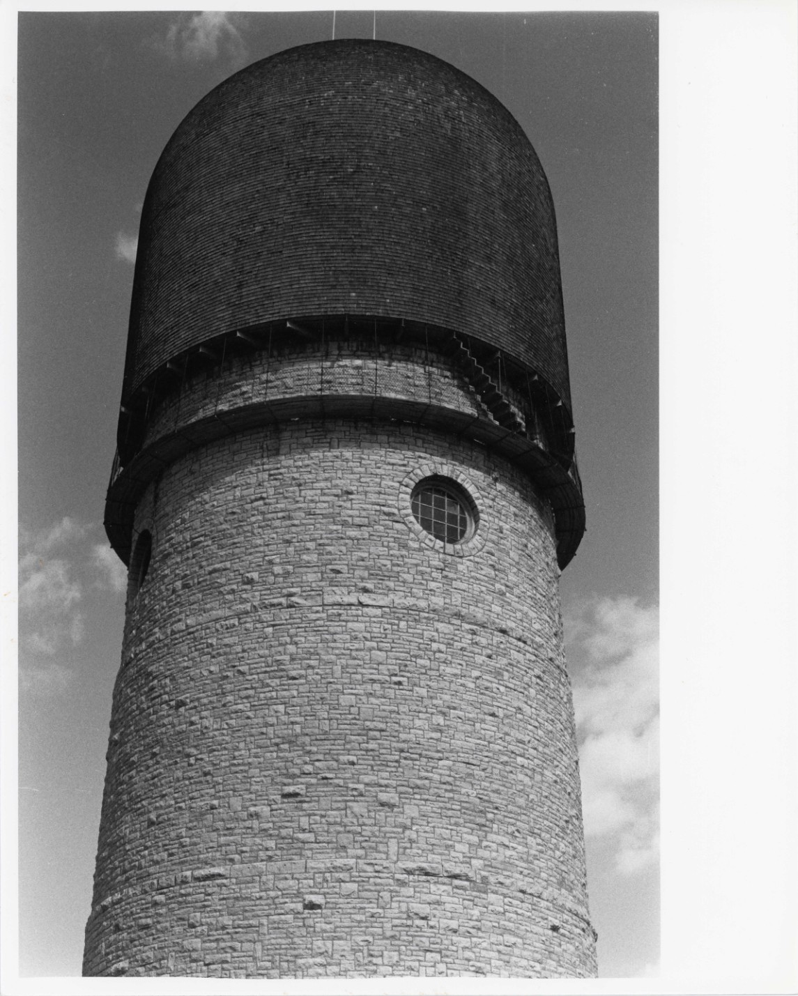 The Ypsilanti Water Tower is located on a triangular plot of land at the intersection of Summit and Cross streets, facing southeast toward Washtenaw Avenue on the edge of the Eastern Michigan University campus. It is a cylindrical-shaped structure of Joliet limestone, topped by a domed, shingled roof with cupola. Measuring 42 feet in diameter and 147 feet in height, the tower's shaft wall and three interior walls house a 250,000 gallon steel water tank which rests on a concrete foundation. Built at a cost of $21,132 as part of a civic water-works system, the tower was constructed by William R. Coats in 1890. The tower's lower segment, measuring 85 feet in height, is faced with white-colored Joliet limestone and enframes a rounded arch entry with stone voussiers. Three limestone belt courses encircle the shaft wall, while circular stone windows with square paning are visible at its upper elevation. The shaft wall is four inches thick at its grade line, and two feet thick at its top. Three stone interior walls, matching the outer wall in height and thickness, house a 250,000 gallon steel water tank built by the Detroit Water Works Company, which rests on ten inch steel I-beams. A circular oak catwalk and iron railway leads to the tower's upper segment, a domed roof of cedar shingles measuring 85 feet in height, which is topped, in turn, by a copper octagonal cupola with glazed windows. The Ypsilanti Community Utilities Authority (YCUA) has operated the water tower since 1974. Its extensive renovation by the YCUA in 1976 included roof reshingling, beam replacement and painting at a cost of $114,694, a figure five times higher than its original cost of construction.